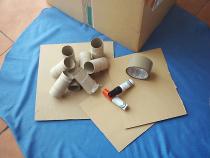 Paso 2: Adherimos los tubos de cartón a la caja con la cinta de empaquetar. Para dar diferentes posiciones a los tubos los cortamos en ángulos diferentes.