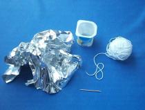 Paso 3: Introducimos el hilo de lana por el agujero del vaso de yogur y hacemos un nudo para que no se salga. Podemos hacer el nudo a un palillo de dientes para impedir que el hilo de lana se salga del vaso de yogur (opcional).